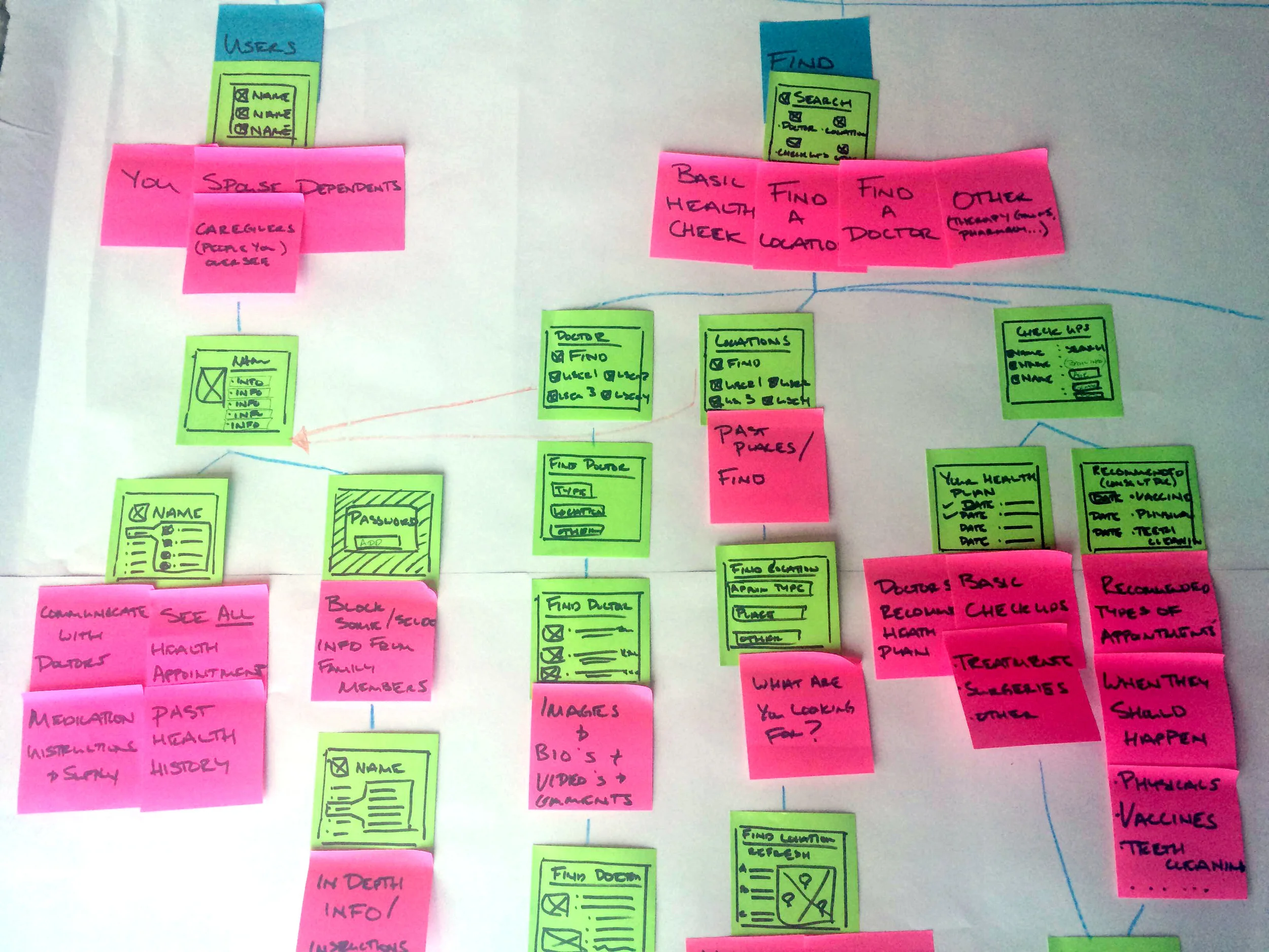Laying out main categories and what information is needed in the app. Using Post-It notes allowed for easy adjusting and kept ideas flexible. Priority categories were established and supporting information was generated based on walk-throughs.